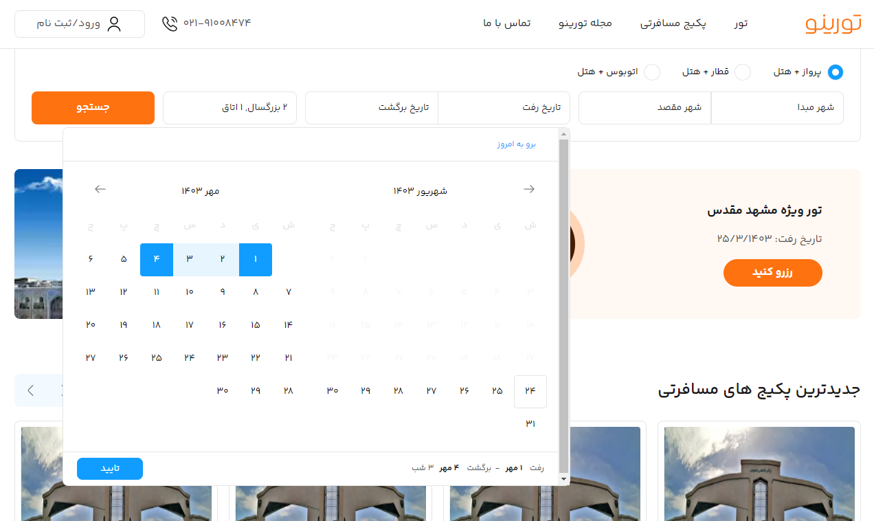 برای رزرو تور، ابتدا وارد سایت تورینو شده و از قسمت نوار جستجوی بالای سایت شهر مبدا، شهر مقصد، تاریخ رفت و برگشت و تعداد مسافران خود را انتخاب کنید و سپس روی دکمه جستجو کلیک کنید.
