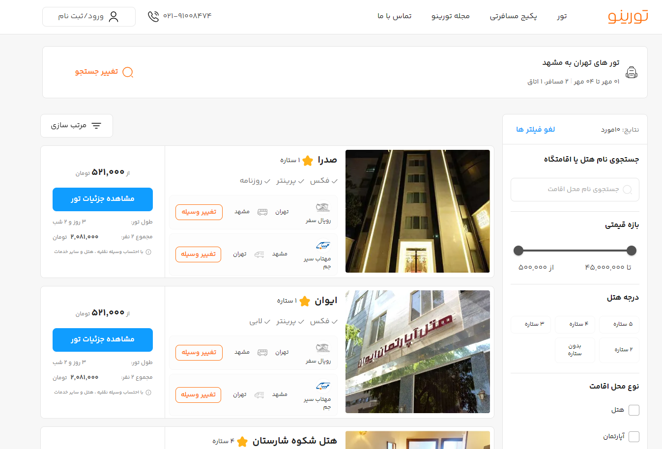 به کمک فیلتر های گوناگون و مقایسه قیمت ها، هتل متخب خود را برای تور انتخاب کنید. توجه داشته باشید که تورینو همیشه کمترین قیمت را به شما نمایش می دهد. همچنین می توانید با کلیک بر روی نام هتل، جزئیات هتل را نیز بررسی کنید.