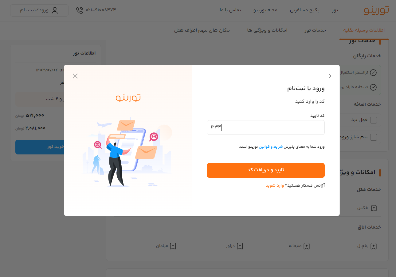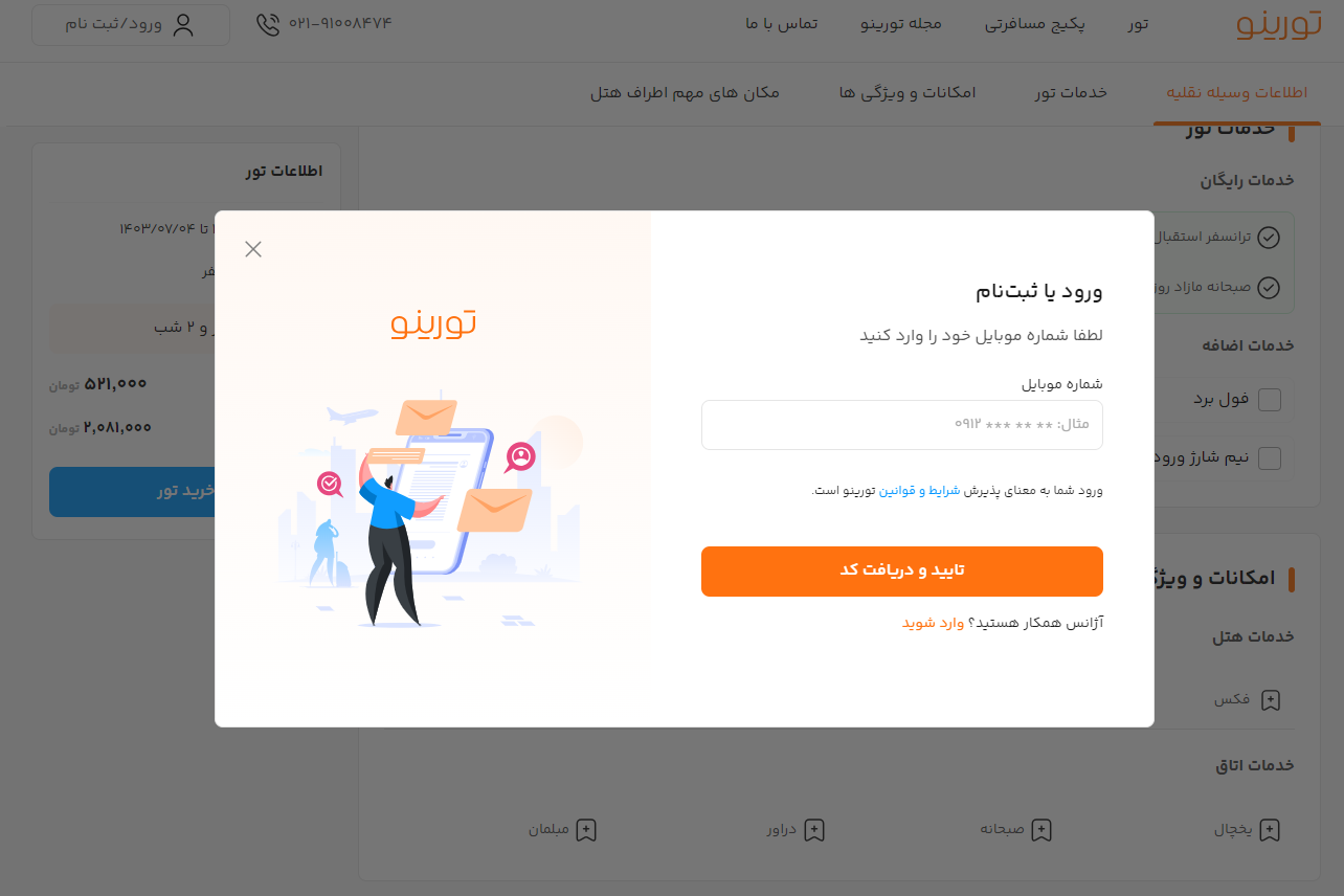 اگر تا به حال در سایت تورینو وارد نشده باشید، در این مرحله میبایست شماره موبایل خود را برای دریافت پیامک تایید وارد کنید. تمامی مشخصات شما نزد تورینو محفوظ است.