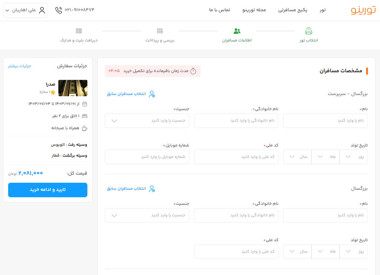در این مرحله میبایست مشخصات کامل مسافرین خود را وارد کنید و سپس بر روی دکمه ذخیره اطلاعات مسافران کلیک کنید. از دفعات بعد، اطلاعات مسافران شما ذخیره خواهد شد و از قسمت مسافرین من قابل دسترسی است