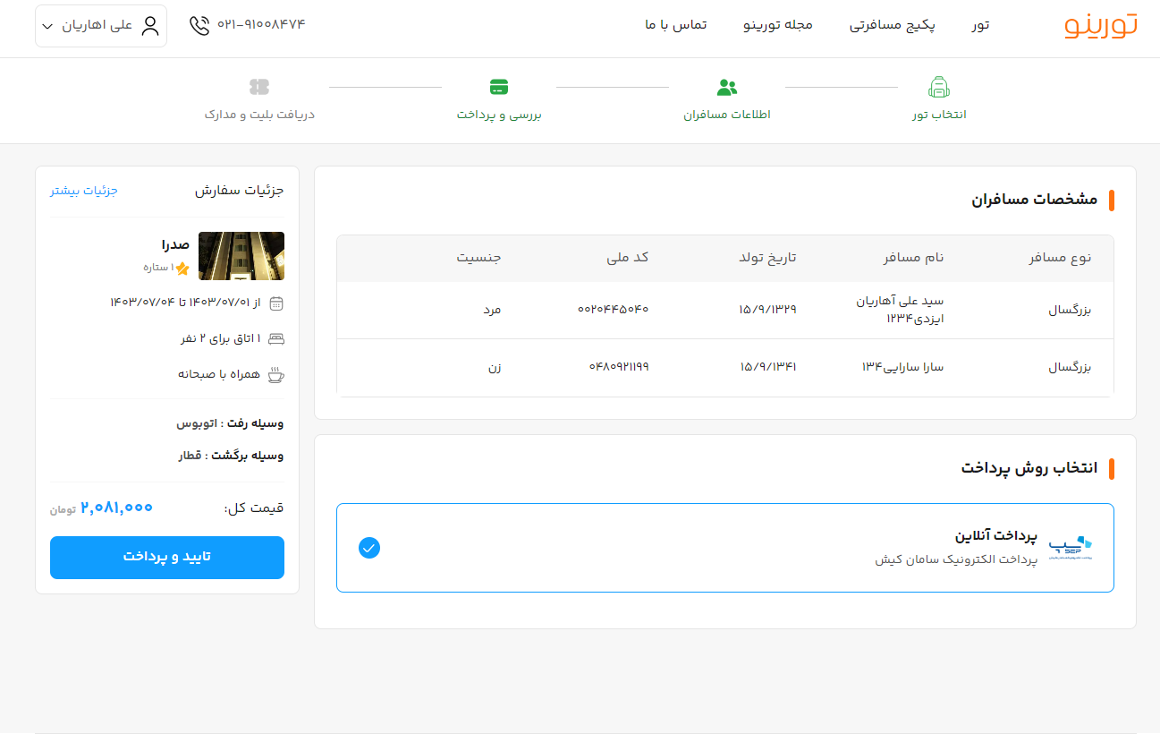 در این مرحله خلاصه سفارش خود را بررسی کنید و در صورت اطمینان از صحت اطلاعات تور و مسافران روی دکمه تایید و پرداخت کلیک کنید تا به درگاه منتقل شوید.